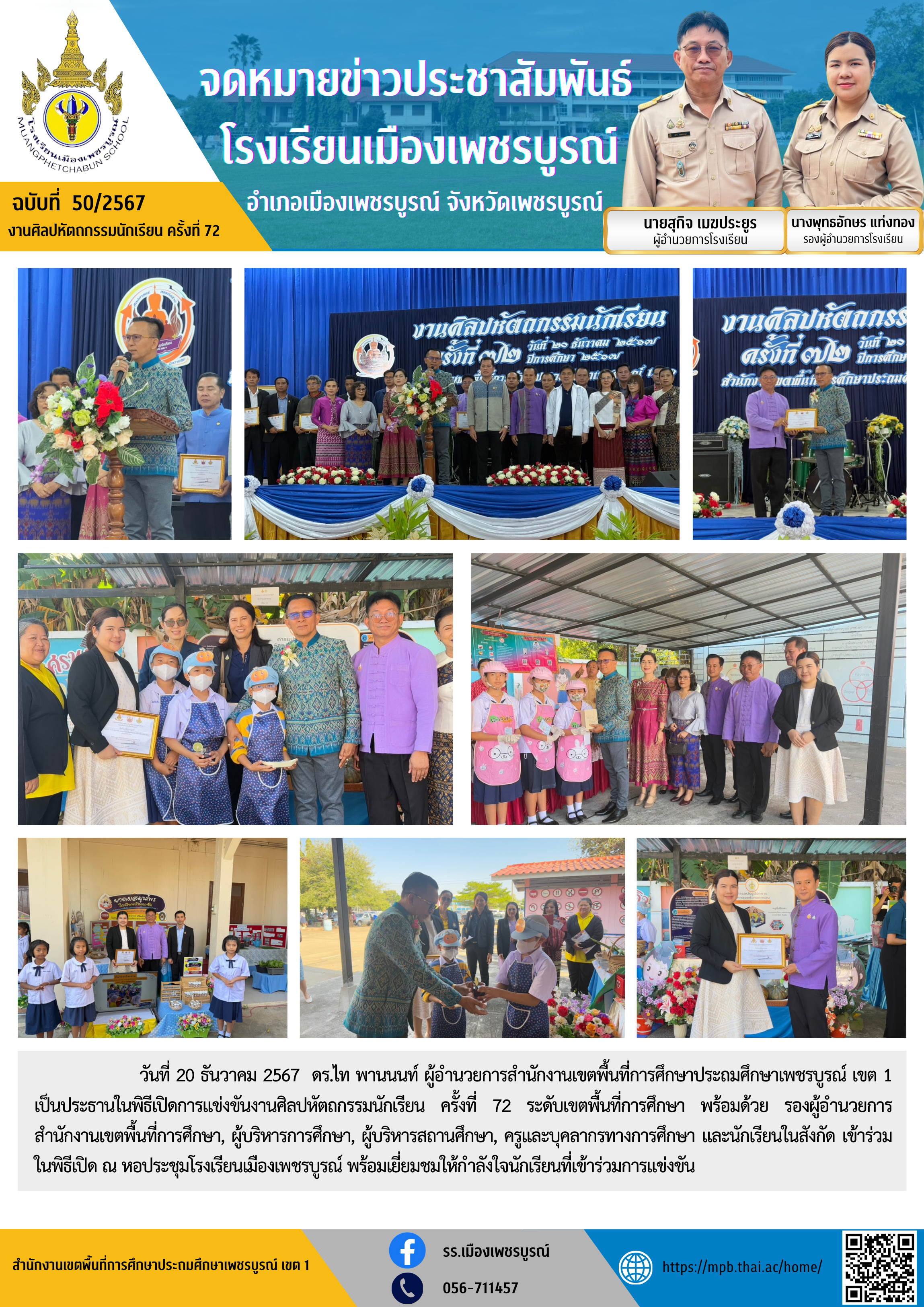วันที่ 20 ธันวาคม 2567 ดร.ไท พานนนท์ ผู้อำนวยการสำนักงานเขตพื้นที่การศึกษาประถมศึกษาเพชรบูรณ์ เขต 1 เป็นประธานในพิธีเปิดการแข่งขันงานศิลปหัตถกรรมนักเรียน ครั้งที่ 72 ระดับเขตพื้นที่การศึกษา พร้อมด้วย รองผู้อำนวยการสำนักงานเขตพื้นที่การศึกษา, ผู้บริหารการศึกษา, ผู้บริหารสถานศึกษา, ครูและบุคลากรทางการศึกษา และนักเรียนในสังกัด เข้าร่วมในพิธีเปิด ณ หอประชุมโรงเรียนเมืองเพชรบูรณ์ พร้อมเยี่ยมชมให้กำลังใจนักเรียนที่เข้าร่วมการแข่งขัน