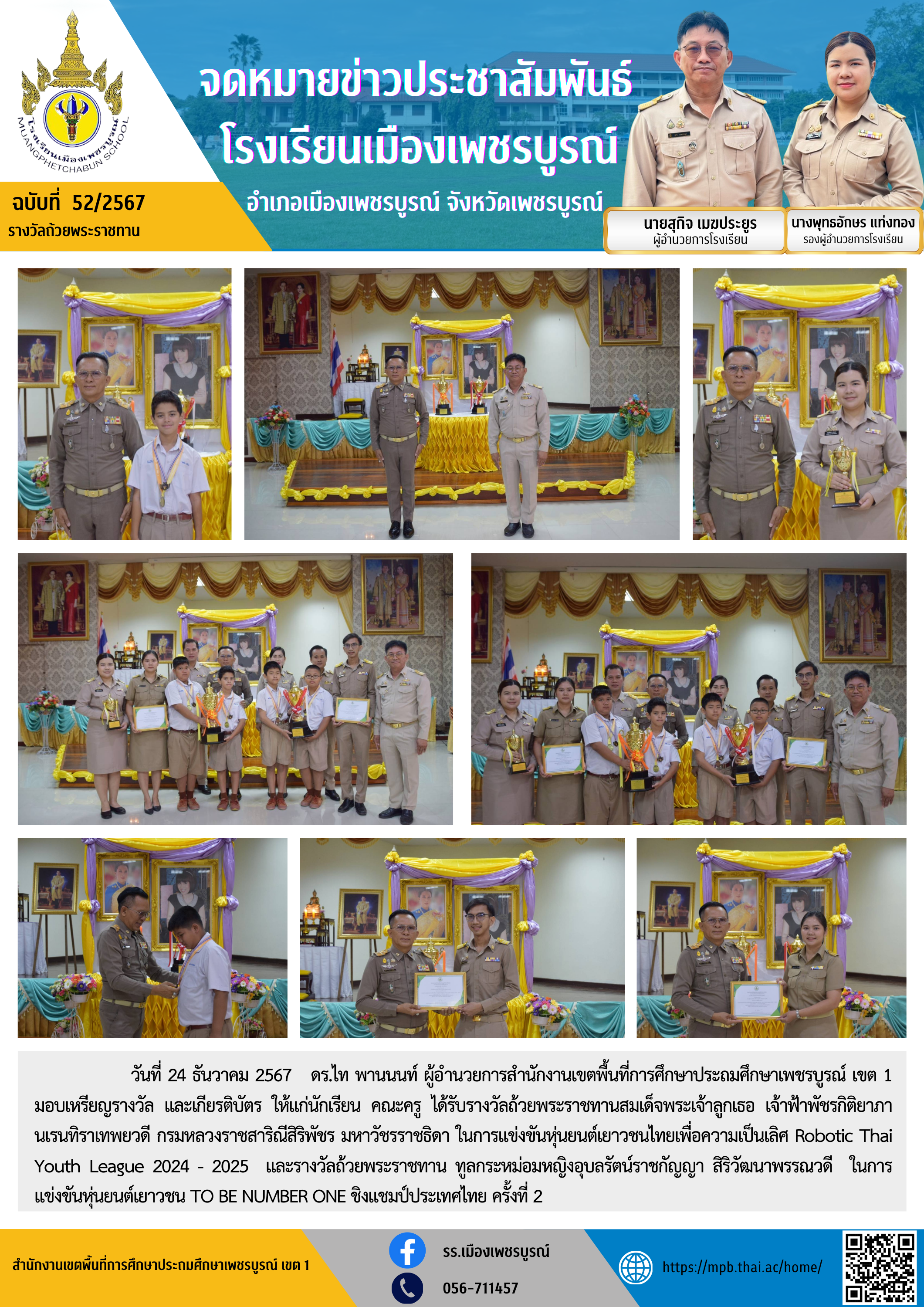 วันที่ 24 ธันวาคม 2567 ดร.ไท พานนนท์ ผู้อำนวยการสำนักงานเขตพื้นที่การศึกษาประถมศึกษาเพชรบูรณ์ เขต 1 มอบเหรียญรางวัล และเกียรติบัตร ให้แก่นักเรียน คณะครู ได้รับรางวัลถ้วยพระราชทานสมเด็จพระเจ้าลูกเธอ เจ้าฟ้าพัชรกิติยาภา นเรนทิราเทพยวดี กรมหลวงราชสาริณีสิริพัชร มหาวัชรราชธิดา ในการแข่งขันหุ่นยนต์เยาวชนไทยเพื่อความเป็นเลิศ Robotic Thai Youth League 2024 - 2025 และรางวัลถ้วยพระราชทาน ทูลกระหม่อมหญิงอุบลรัตน์ราชกัญญา สิริวัฒนาพรรณวดี ในการแข่งขันหุ่นยนต์เยาวชน TO BE NUMBER ONE ชิงแชมป์ประเทศไทย ครั้งที่ 2