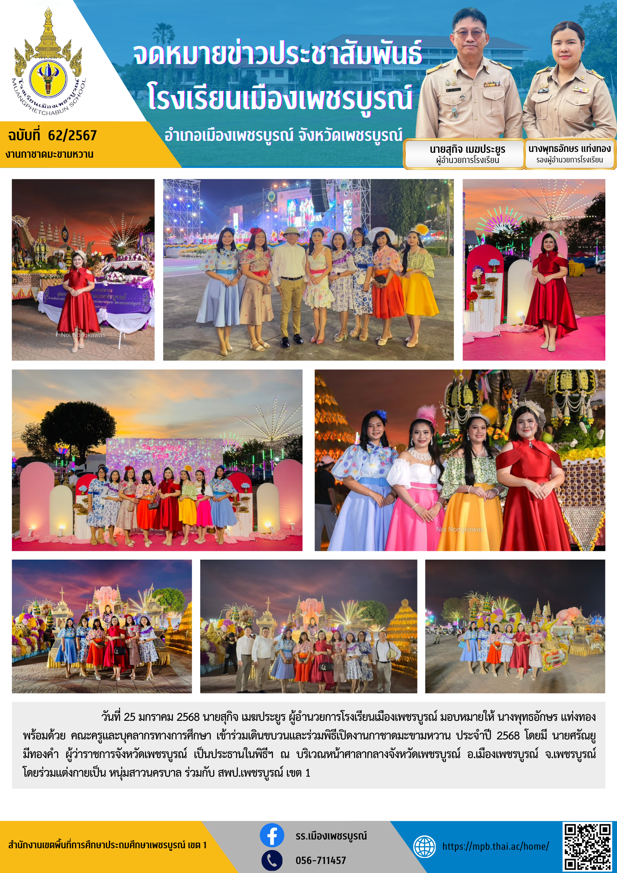 วันที่ 25 มกราคม 2568 นายสุกิจ เมฆประยูร ผู้อำนวยการโรงเรียนเมืองเพชรบูรณ์ มอบหมายให้ นางพุทธอักษร แท่งทอง พร้อมด้วย คณะครูและบุคลากรทางการศึกษา เข้าร่วมเดินขบวนและร่วมพิธีเปิดงานกาชาดมะขามหวาน ประจำปี 2568 โดยมี นายศรัณยู มีทองคำ ผู้ว่าราชการจังหวัดเพชรบูรณ์ เป็นประธานในพิธีฯ ณ บริเวณหน้าศาลากลางจังหวัดเพชรบูรณ์ อ.เมืองเพชรบูรณ์ จ.เพชรบูรณ์ โดยร่วมแต่งกายเป็น หนุ่มสาวนครบาล ร่วมกับ สพป.เพชรบูรณ์ เขต 1