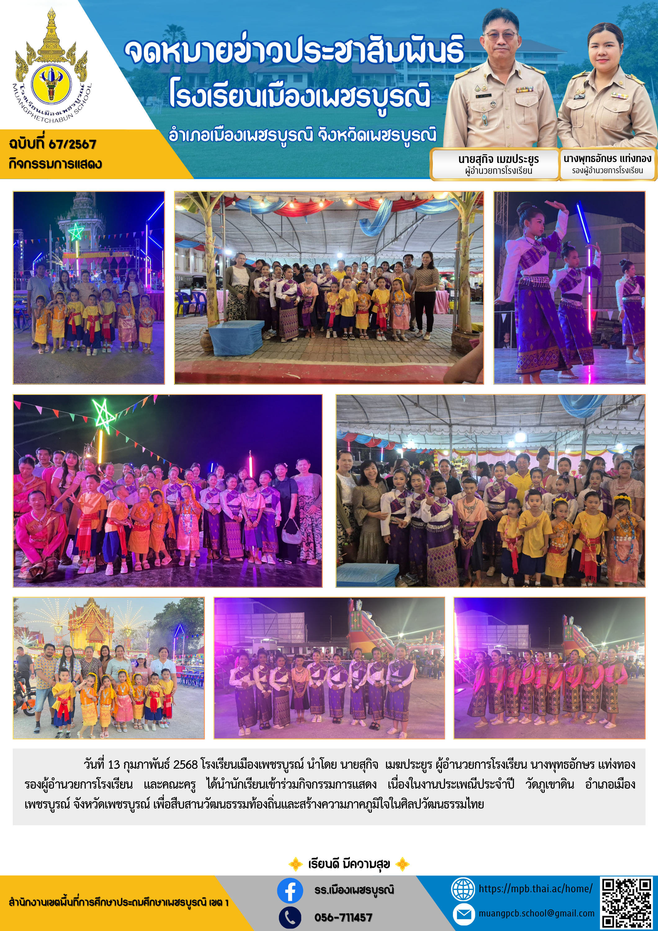 วันที่ 13 กุมภาพันธ์ 2568 โรงเรียนเมืองเพชรบูรณ์ นำโดย นายสุกิจ เมฆประยูร ผู้อำนวยการโรงเรียน นางพุทธอักษร แท่งทอง รองผู้อำนวยการโรงเรียน และคณะครู ได้นำนักเรียนเข้าร่วมกิจกรรมการแสดง เนื่องในงานประเพณีประจำปี วัดภูเขาดิน อำเภอเมืองเพชรบูรณ์ จังหวัดเพชรบูรณ์ เพื่อสืบสานวัฒนธรรมท้องถิ่นและสร้างความภาคภูมิใจในศิลปวัฒนธรรมไทย