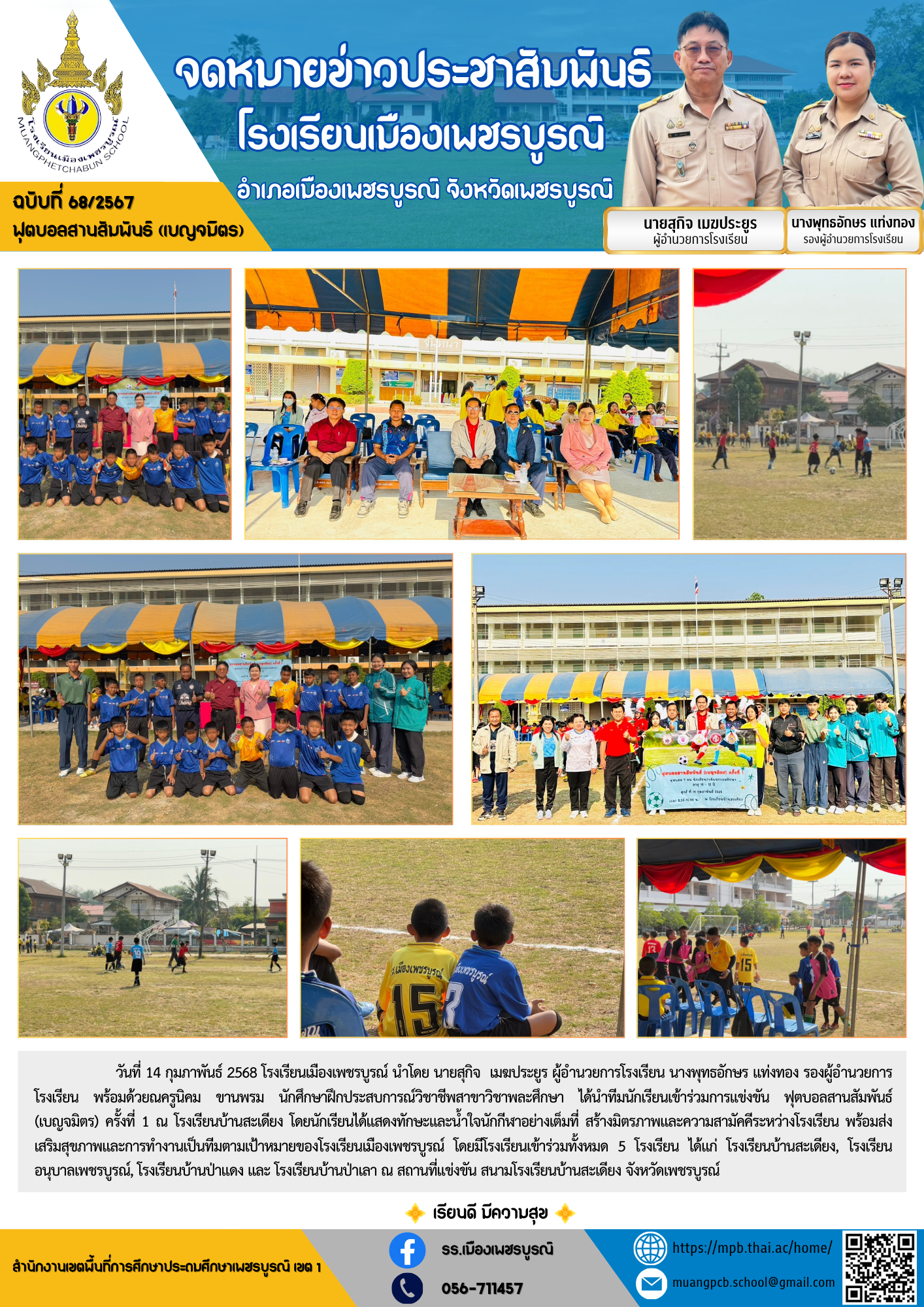 วันที่ 14 กุมภาพันธ์ 2568 โรงเรียนเมืองเพชรบูรณ์ นำโดย นายสุกิจ เมฆประยูร ผู้อำนวยการโรงเรียน นางพุทธอักษร แท่งทอง รองผู้อำนวยการโรงเรียน พร้อมด้วยณครูนิคม ขานพรม นักศึกษาฝึกประสบการณ์วิชาชีพสาขาวิชาพละศึกษา ได้นำทีมนักเรียนเข้าร่วมการแข่งขัน ฟุตบอลสานสัมพันธ์ (เบญจมิตร) ครั้งที่ 1 ณ โรงเรียนบ้านสะเดียง โดยนักเรียนได้แสดงทักษะและน้ำใจนักกีฬาอย่างเต็มที่ สร้างมิตรภาพและความสามัคคีระหว่างโรงเรียน พร้อมส่งเสริมสุขภาพและการทำงานเป็นทีมตามเป้าหมายของโรงเรียนเมืองเพชรบูรณ์ โดยมีโรงเรียนเข้าร่วมทั้งหมด 5 โรงเรียน ได้แก่ โรงเรียนบ้านสะเดียง, โรงเรียนอนุบาลเพชรบูรณ์, โรงเรียนบ้านป่าแดง และ โรงเรียนบ้านป่าเลา ณ สถานที่แข่งขัน สนามโรงเรียนบ้านสะเดียง จังหวัดเพชรบูรณ์