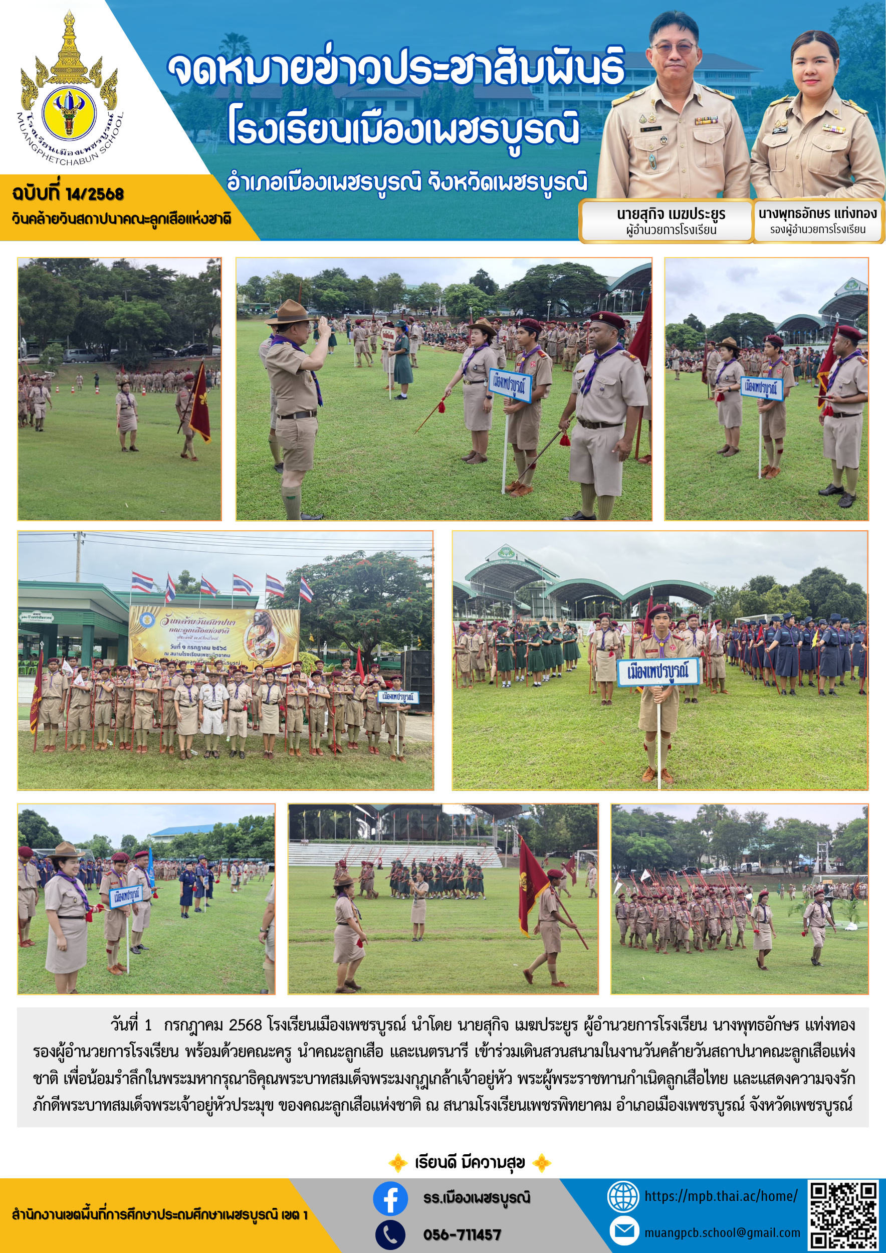 วันที่ 1 กรกฎาคม 2568 โรงเรียนเมืองเพชรบูรณ์ นำโดย นายสุกิจ เมฆประยูร ผู้อำนวยการโรงเรียน นางพุทธอักษร แท่งทอง รองผู้อำนวยการโรงเรียน พร้อมด้วยคณะครู นำคณะลูกเสือ และเนตรนารี เข้าร่วมเดินสวนสนามในงานวันคล้ายวันสถาปนาคณะลูกเสือแห่งชาติ เพื่อน้อมรำลึกในพระมหากรุณาธิคุณพระบาทสมเด็จพระมงกุฎเกล้าเจ้าอยู่หัว พระผู้พระราชทานกำเนิดลูกเสือไทย และแสดงความจงรักภักดีพระบาทสมเด็จพระเจ้าอยู่หัวประมุข ของคณะลูกเสือแห่งชาติ ณ สนามโรงเรียนเพชรพิทยาคม อำเภอเมืองเพชรบูรณ์ จังหวัดเพชรบูรณ์