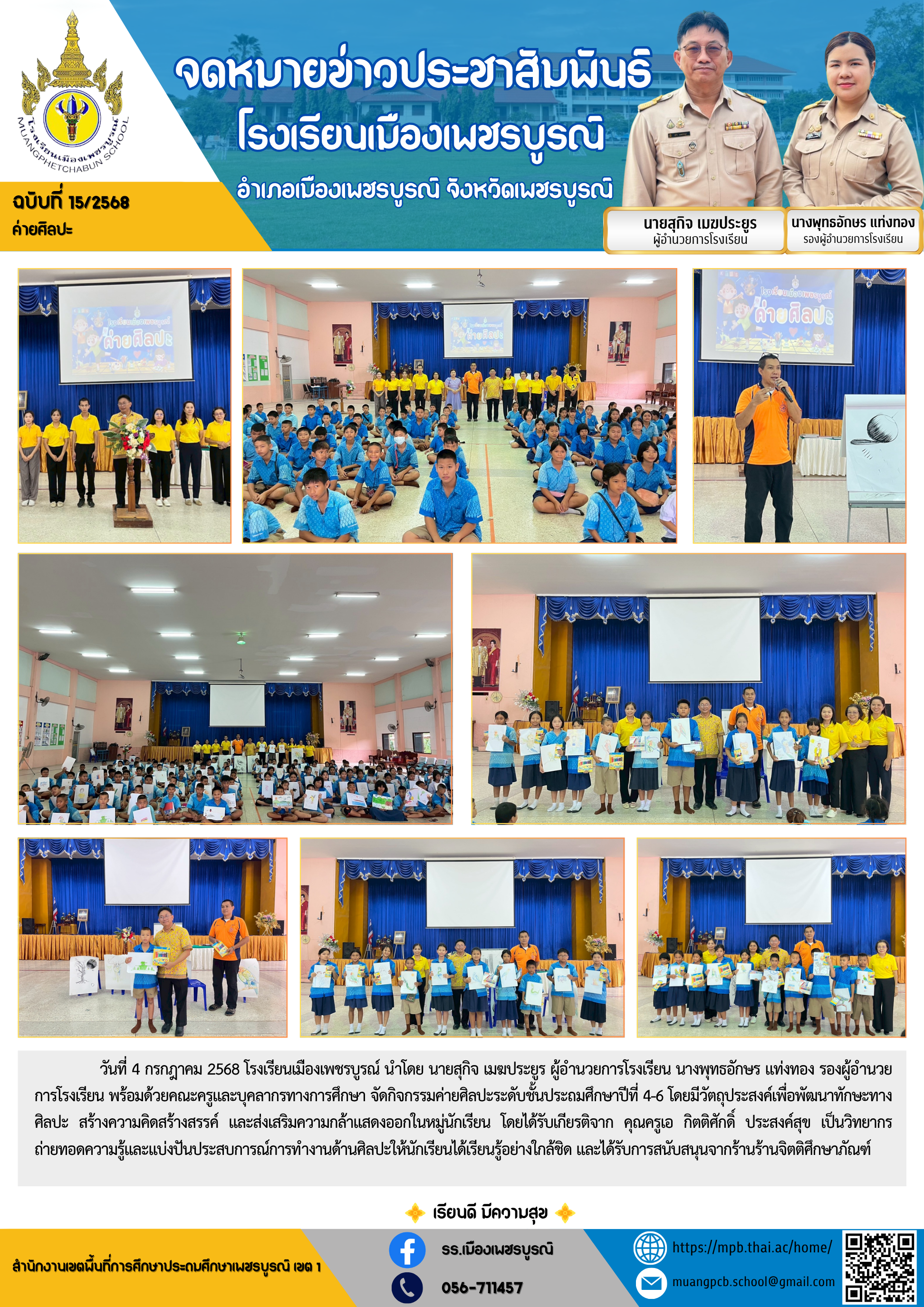 วันที่ 4 กรกฎาคม 2568 โรงเรียนเมืองเพชรบูรณ์ นำโดย นายสุกิจ เมฆประยูร ผู้อำนวยการโรงเรียน นางพุทธอักษร แท่งทอง รองผู้อำนวยการโรงเรียน พร้อมด้วยคณะครูและบุคลากรทางการศึกษา จัดกิจกรรมค่ายศิลปะระดับชั้นประถมศึกษาปีที่ 4-6 โดยมีวัตถุประสงค์เพื่อพัฒนาทักษะทางศิลปะ สร้างความคิดสร้างสรรค์ และส่งเสริมความกล้าแสดงออกในหมู่นักเรียน โดยได้รับเกียรติจาก คุณครูเอ กิตติศักดิ์ ประสงค์สุข เป็นวิทยากร ถ่ายทอดความรู้และแบ่งปันประสบการณ์การทำงานด้านศิลปะให้นักเรียนได้เรียนรู้อย่างใกล้ชิด และได้รับการสนับสนุนจากร้านร้านจิตติศึกษาภัณฑ์