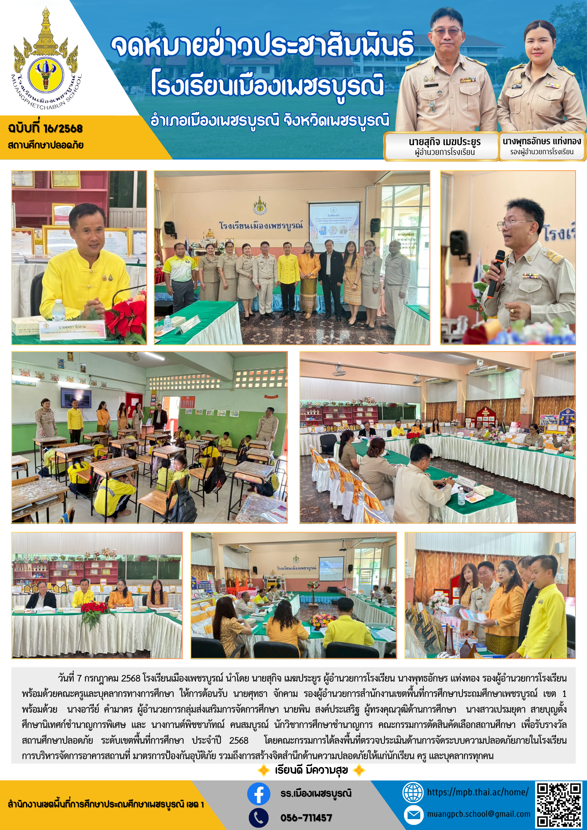 วันที่ 7 กรกฎาคม 2568 โรงเรียนเมืองเพชรบูรณ์ นำโดย นายสุกิจ เมฆประยูร ผู้อำนวยการโรงเรียน นางพุทธอักษร แท่งทอง รองผู้อำนวยการโรงเรียน พร้อมด้วยคณะครูและบุคลากรทางการศึกษา ให้การต้อนรับ นายศุทธา จักคาม รองผู้อำนวยการสำนักงานเขตพื้นที่การศึกษาประถมศึกษาเพชรบูรณ์ เขต 1 พร้อมด้วย นางอารีย์ คำมาตร ผู้อำนวยการกลุ่มส่งเสริมการจัดการศึกษา นายพิน สงค์ประเสริฐ ผู้ทรงคุณวุฒิด้านการศึกษา นางสาวเปรมยุดา สายบุญตั้ง ศึกษานิเทศก์ชำนาญการพิเศษ และ นางกานต์พิชชาภัทณ์ คนสมบูรณ์ นักวิชาการศึกษาชำนาญการ คณะกรรมการตัดสินคัดเลือกสถานศึกษา เพื่อรับรางวัลสถานศึกษาปลอดภัย ระดับเขตพื้นที่การศึกษา ประจำปี 2568 โดยคณะกรรมการได้ลงพื้นที่ตรวจประเมินด้านการจัดระบบความปลอดภัยภายในโรงเรียน การบริหารจัดการอาคารสถานที่ มาตรการป้องกันอุบัติภัย รวมถึงการสร้างจิตสำนึกด้านความปลอดภัยให้แก่นักเรียน ครู และบุคลากรทุกคน