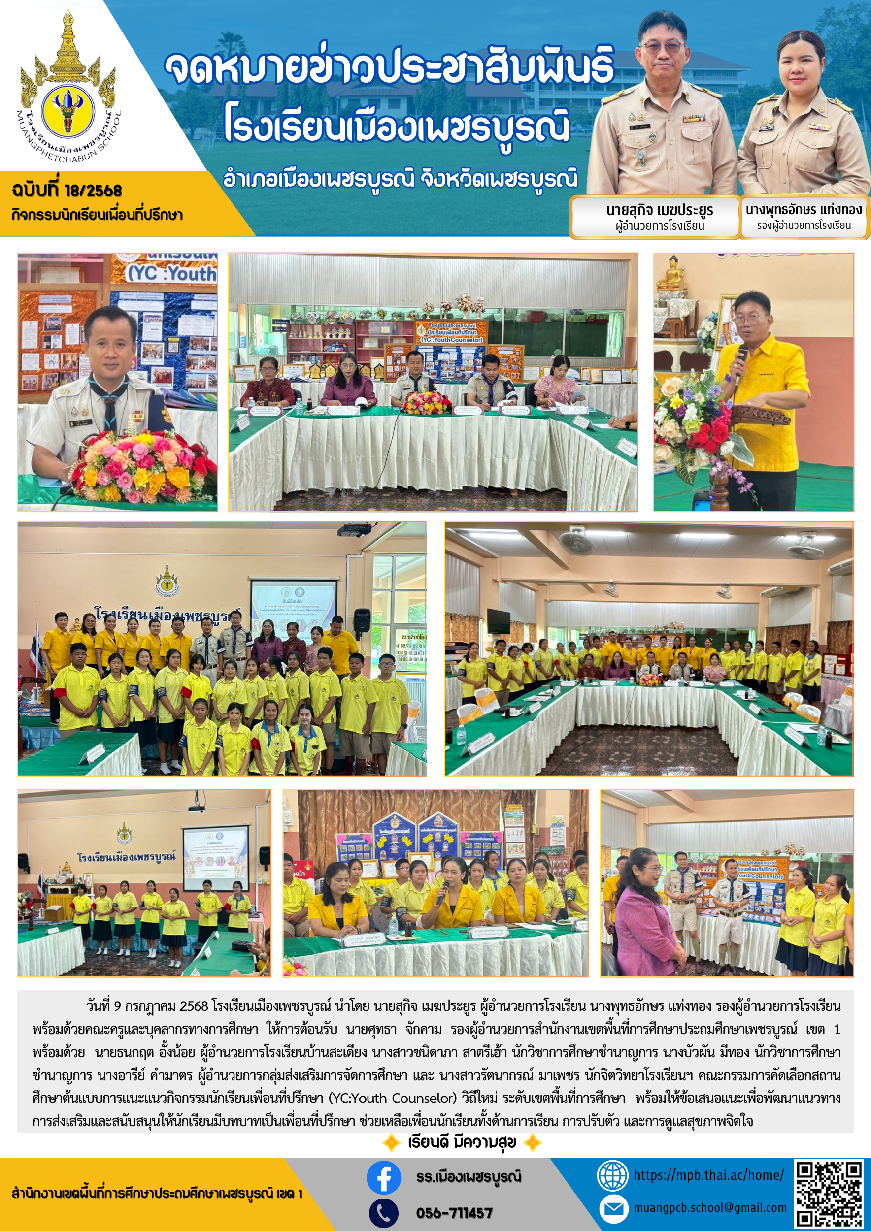 วันที่ 9 กรกฎาคม 2568 โรงเรียนเมืองเพชรบูรณ์ นำโดย นายสุกิจ เมฆประยูร ผู้อำนวยการโรงเรียน นางพุทธอักษร แท่งทอง รองผู้อำนวยการโรงเรียน พร้อมด้วยคณะครูและบุคลากรทางการศึกษา ให้การต้อนรับ นายศุทธา จักคาม รองผู้อำนวยการสำนักงานเขตพื้นที่การศึกษาประถมศึกษาเพชรบูรณ์ เขต 1 พร้อมด้วย นายธนกฤต อั้งน้อย ผู้อำนวยการโรงเรียนบ้านสะเดียง นางสาวชนิดาภา สาตรีเฮ้า นักวิชาการศึกษาชำนาญการ นางบัวผัน มีทอง นักวิชาการศึกษาชำนาญการ นางอารีย์ คำมาตร ผู้อำนวยการกลุ่มส่งเสริมการจัดการศึกษา และ นางสาวรัตนากรณ์ มาเพชร นักจิตวิทยาโรงเรียนฯ คณะกรรมการคัดเลือกสถานศึกษาต้นแบบการแนะแนวกิจกรรมนักเรียนเพื่อนที่ปรึกษา (YC:Youth Counselor) วิถีใหม่ ระดับเขตพื้นที่การศึกษา พร้อมให้ข้อเสนอแนะเพื่อพัฒนาแนวทางการส่งเสริมและสนับสนุนให้นักเรียนมีบทบาทเป็นเพื่อนที่ปรึกษา ช่วยเหลือเพื่อนนักเรียนทั้งด้านการเรียน การปรับตัว และการดูแลสุขภาพจิตใจ