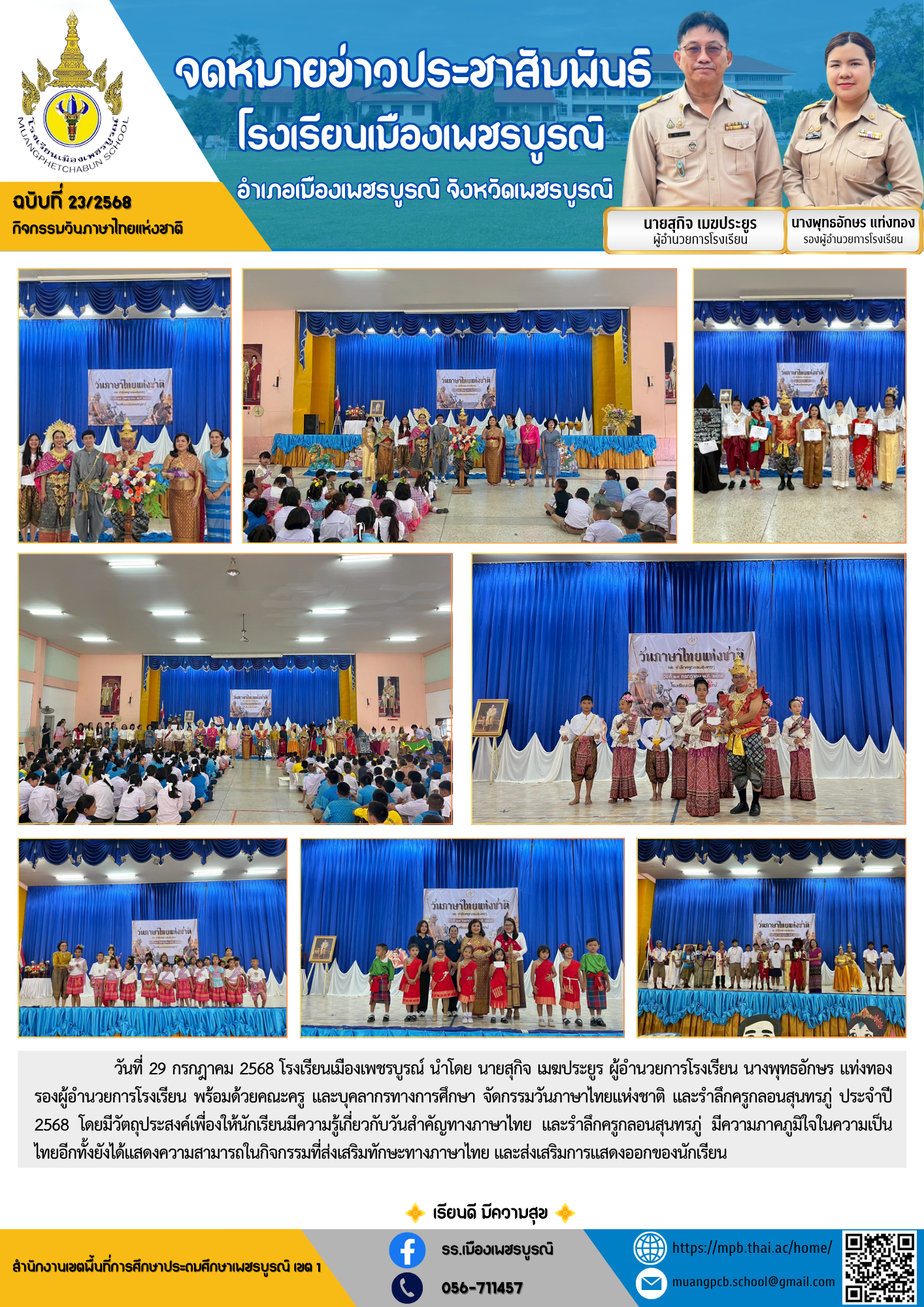วันที่ 29 กรกฎาคม 2568 โรงเรียนเมืองเพชรบูรณ์ นำโดย นายสุกิจ เมฆประยูร ผู้อำนวยการโรงเรียน นางพุทธอักษร แท่งทอง รองผู้อำนวยการโรงเรียน พร้อมด้วยคณะครู และบุคลากรทางการศึกษา จัดกิจกรรมวันภาษาไทยแห่งชาติ และรำลึกครูกลอนสุนทรภู่ ประจำปี 2568 โดยมีวัตถุประสงค์เพื่องให้นักเรียนมีความรู้เกี่ยวกับวันสำคัญทางภาษาไทย และรำลึกครูกลอนสุนทรภู่ มีความภาคภูมิใจในความเป็นไทยอีกทั้งยังได้แสดงความสามารถในกิจกรรมที่ส่งเสริมทักษะทางภาษาไทย และส่งเสริมการแสดงออกของนักเรียน