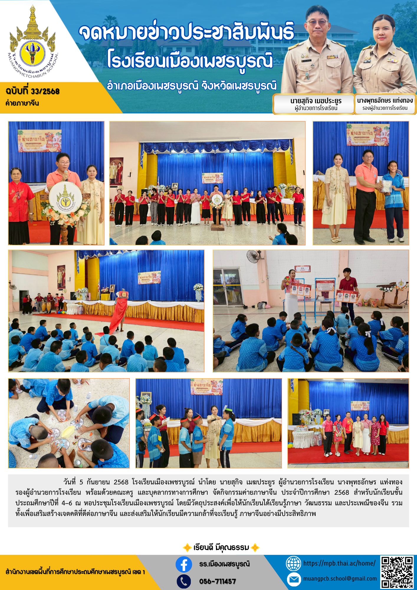 วันที่ 5 กันยายน 2568 โรงเรียนเมืองเพชรบูรณ์ นำโดย นายสุกิจ เมฆประยูร ผู้อำนวยการโรงเรียน นางพุทธอักษร แท่งทอง รองผู้อำนวยการโรงเรียน พร้อมด้วยคณะครู และบุคลากรทางการศึกษา จัดกิจกรรมค่ายภาษาจีน ประจำปีการศึกษา 2568 สำหรับนักเรียนชั้นประถมศึกษาปีที่ 4–6 ณ หอประชุมโรงเรียนเมืองเพชรบูรณ์ โดยมีวัตถุประสงค์เพื่อให้นักเรียนได้เรียนรู้ภาษา วัฒนธรรม และประเพณีของจีน รวมทั้งเพื่อเสริมสร้างเจตคติที่ดีต่อภาษาจีน และส่งเสริมให้นักเรียนมีความกล้าที่จะเรียนรู้ ภาษาจีนอย่างมีประสิทธิภาพ