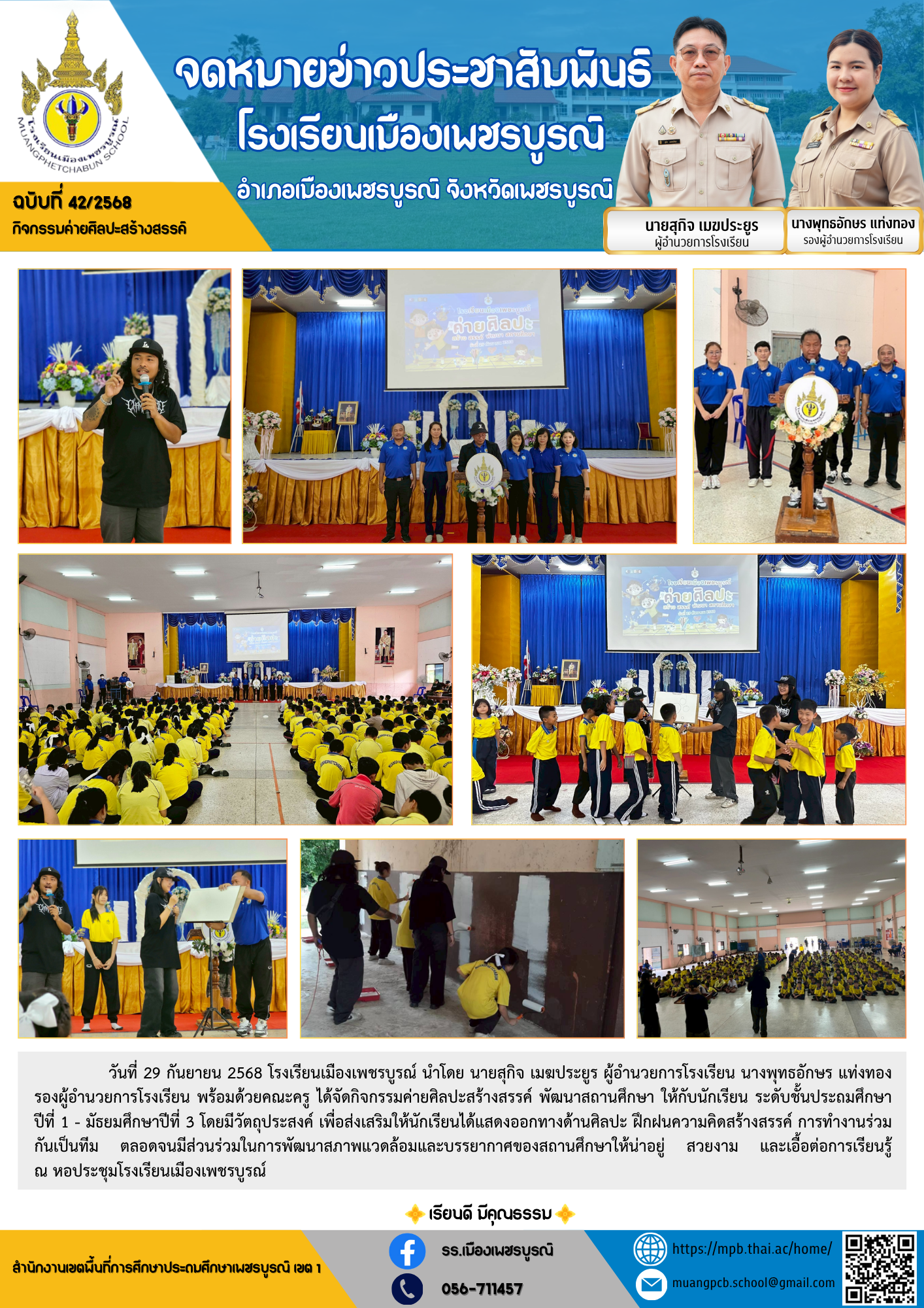 วันที่ 29 กันยายน 2568 โรงเรียนเมืองเพชรบูรณ์ นำโดย นายสุกิจ เมฆประยูร ผู้อำนวยการโรงเรียน นางพุทธอักษร แท่งทอง รองผู้อำนวยการโรงเรียน พร้อมด้วยคณะครู ได้จัดกิจกรรมค่ายศิลปะสร้างสรรค์ พัฒนาสถานศึกษา ให้กับนักเรียน ระดับชั้นประถมศึกษาปีที่ 1 - มัธยมศึกษาปีที่ 3 โดยมีวัตถุประสงค์ เพื่อส่งเสริมให้นักเรียนได้แสดงออกทางด้านศิลปะ ฝึกฝนความคิดสร้างสรรค์ การทำงานร่วมกันเป็นทีม ตลอดจนมีส่วนร่วมในการพัฒนาสภาพแวดล้อมและบรรยากาศของสถานศึกษาให้น่าอยู่ สวยงาม และเอื้อต่อการเรียนรู้ ณ หอประชุมโรงเรียนเมืองเพชรบูรณ์