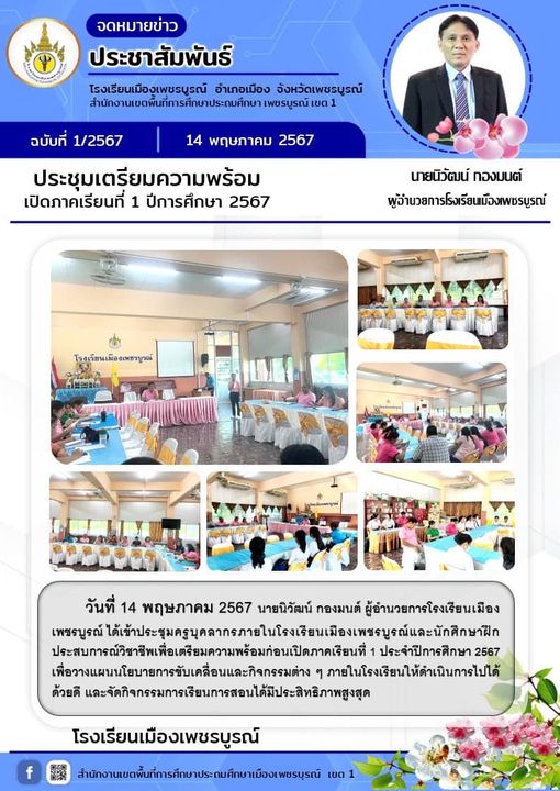 วันที่ 14 พฤษภาคม 2567 นายนิวัฒน์ กองมนต์ ผู้อำนวยการโรงเรียนเมืองเพชรบูรณ์ ประชุมคณะครูบุคลากรภายในโรงเรียนและนักศึกษาฝึกประสบการณ์วิชาชีพครู เพื่อเตรียมความพร้อมเปิดภาคเรียนที่ 1 ปีการศึกษา 2567