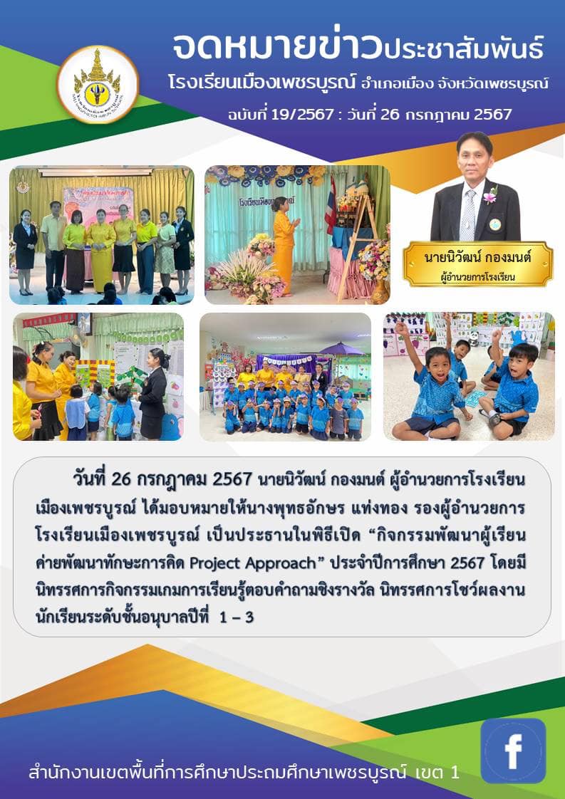 วันที่ 26 กรกฎาคม 2567 นานนิวัฒน์ กองมนต์ ผอ.โรงเรียนเมืองเพชรบูรณ์ ได้มอบหมายให้นางพุทธอักษร แท่งทอง รอง ผอ.โรงเรียนเมืองเพชรบูรณ์ เป็นประธานเปิดกิจกรรมพัฒนาผู้เรียน ค่ายทักษะการคิด Project Approach ของนักเรียนระดับชั้นอนุบาลปีที่ 1-3