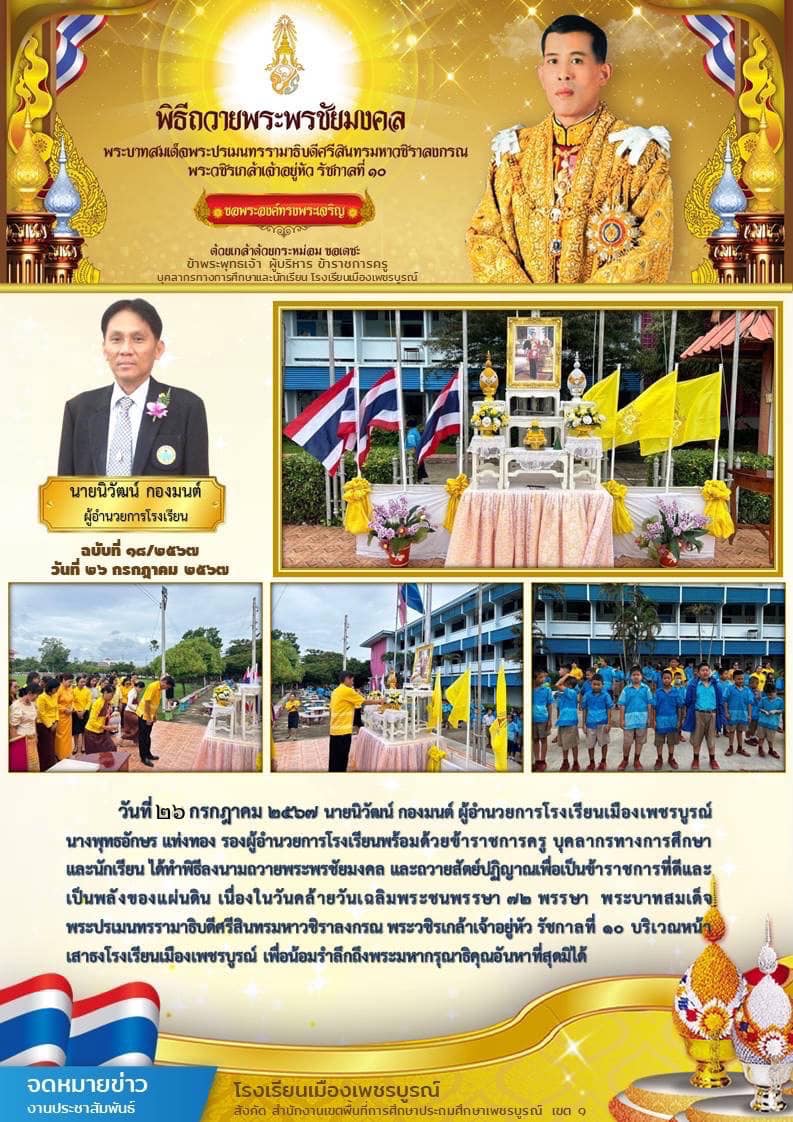 วันที่ 26 กรกฎาคม 2567 นายนิวัฒน์ กองมนต์ ผู้อำนวยการโรงเรียนเมืองเพชรบูรณ์ ข้าราชการครูและบุคลากรทางการศึกษาพร้อมด้วยนักเรียน ได้ร่วมพิธีลงนามถวายพระพรชัยมงคลและถวายสัตย์ปฏิญาณเพื่อเป็นข้าราชการที่ดีและเป็นพลังของแผ่นดิน เนื่องในวันคล้ายวันเฉลิมพระชนพรรษา 72 พรรษา พระบาทสมเด็จพระปรมเมนทรรามาธิบดีศรีสินทรมหาวชิราลงกรณ์พระวชิรเกล้าเจ้าอยู่หัว รัชกาลที่ 10