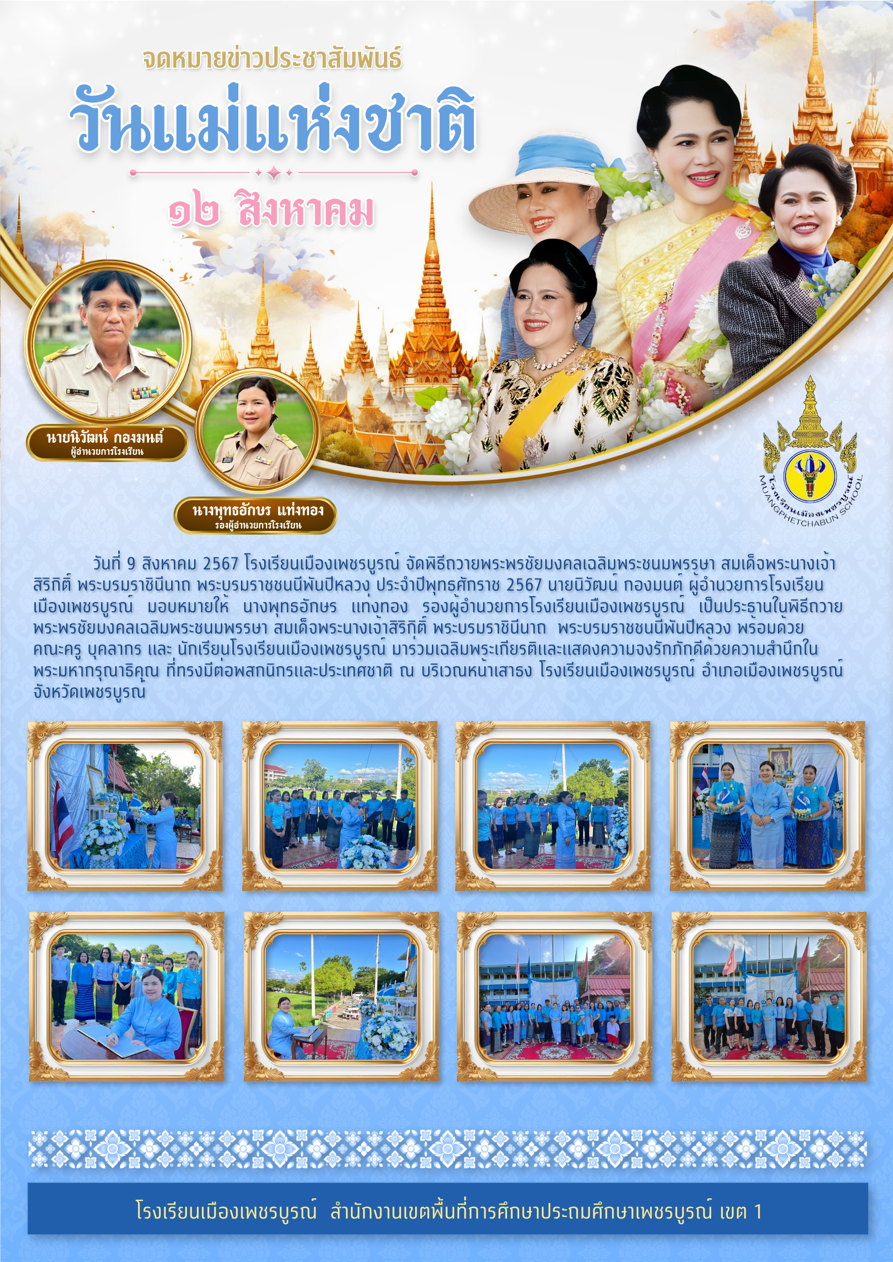 วันที่ 9 สิงหาคม 2567 โรงเรียนเมืองเพชรบูรณ์ จัดพิธีถวายพระพรชัยมงคลเฉลิมพระชนมพรรษา สมเด็จพระนางเจ้าสิริกิติ์ พระบรมราชินีนาถ พระบรมราชชนนีพันปีหลวง ประจำปีพุทธศักราช 2567