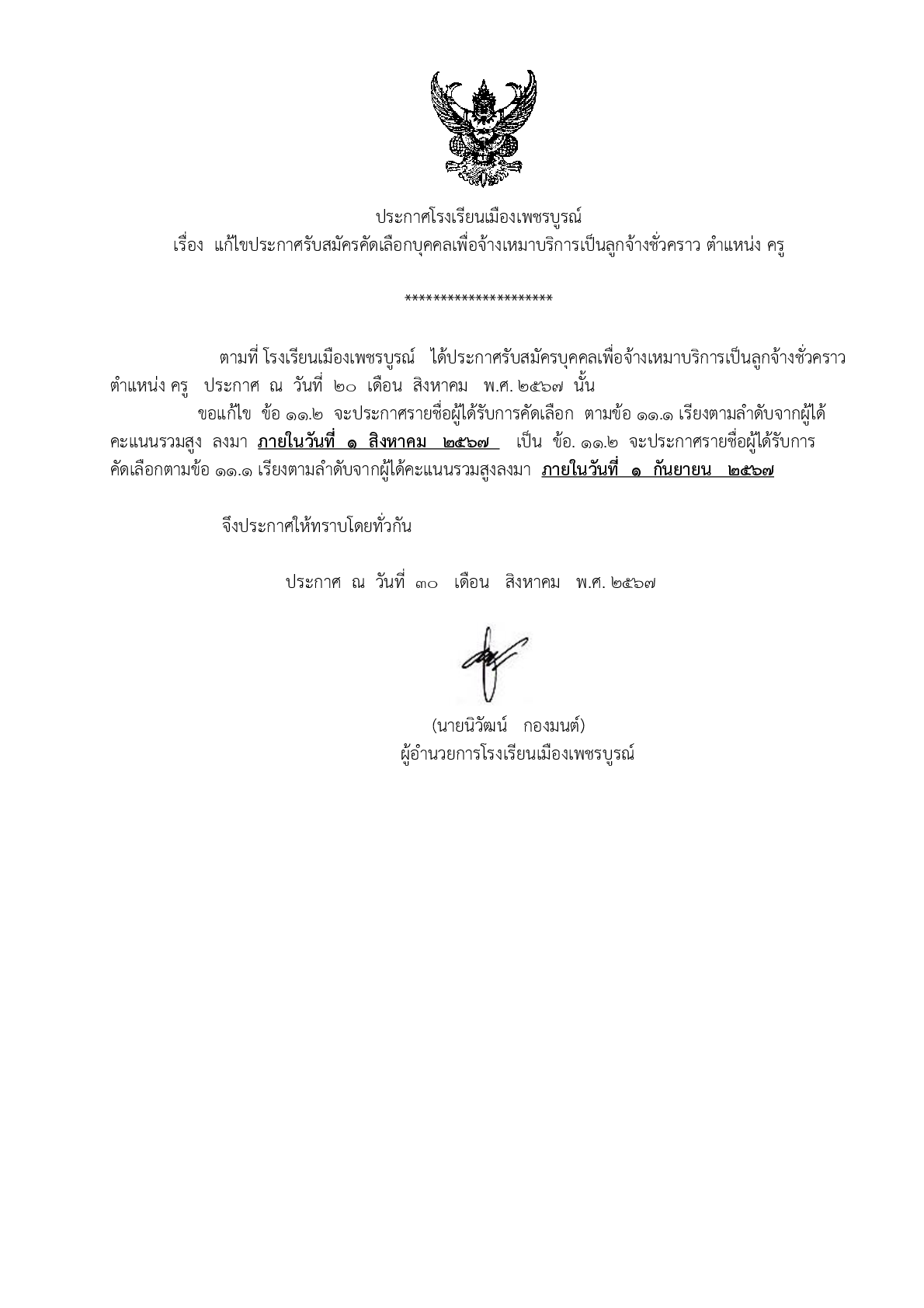 ประกาศโรงเรียนเมืองเพชรบูรณ์ เรื่อง แก้ไขประกาศรับสมัครคัดเลือกบุคคลเพื่อจ้างเหมาบริการเป็นลูกจ้างชั่วคราว ตำแหน่ง ครู