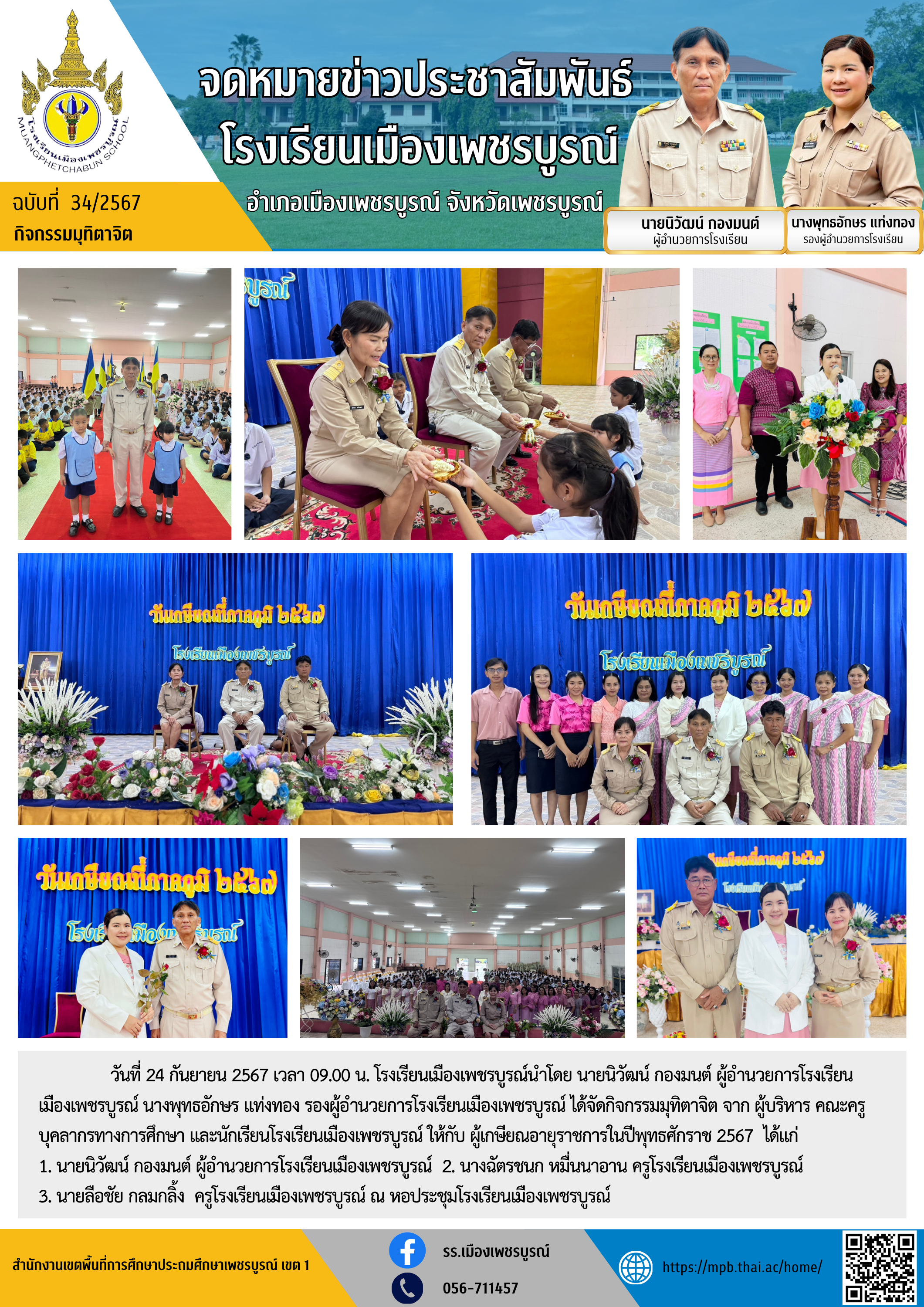 วันที่ 24 กันยายน 2567 เวลา 09.00 น. โรงเรียนเมืองเพชรบูรณ์นำโดย นายนิวัฒน์ กองมนต์ ผู้อำนวยการโรงเรียนเมืองเพชรบูรณ์ นางพุทธอักษร แท่งทอง รองผู้อำนวยการโรงเรียนเมืองเพชรบูรณ์ ได้จัดกิจกรรมมุทิตาจิต จาก ผู้บริหาร คณะครู บุคลากรทางการศึกษา และนักเรียนโรงเรียนเมืองเพชรบูรณ์ ให้กับ ผู้เกษียณอายุราชการในปีพุทธศักราช 2567 ได้แก่ 1. นายนิวัฒน์ กองมนต์ ผู้อำนวยการโรงเรียนเมืองเพชรบูรณ์ 2. นางฉัตรชนก หมื่นนาอาน ครูโรงเรียนเมืองเพชรบูรณ์ 3. นายลือชัย กลมกลิ้ง ครูโรงเรียนเมืองเพชรบูรณ์ ณ หอประชุมโรงเรียนเมืองเพชรบูรณ์