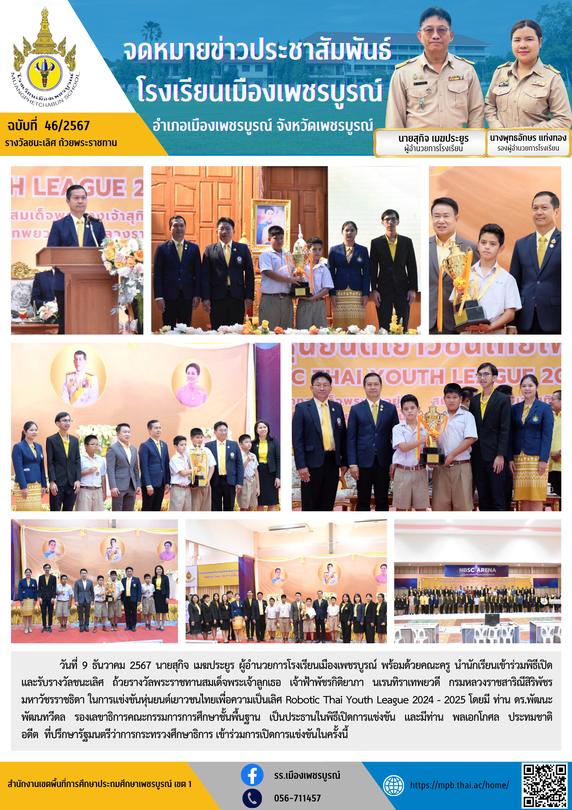 วันที่ 9 ธันวาคม 2567 นายสุกิจ เมฆประยูร ผู้อำนวยการโรงเรียนเมืองเพชรบูรณ์ พร้อมด้วยคณะครู นำนักเรียนเข้าร่วมพิธีเปิด และรับรางวัลชนะเลิศ ถ้วยรางวัลพระราชทานสมเด็จพระเจ้าลูกเธอ เจ้าฟ้าพัชรกิติยาภา นเรนทิราเทพยวดี กรมหลวงราชสาริณีสิริพัชร มหาวัชรราชธิดา ในการแข่งขันหุ่นยนต์เยาวชนไทยเพื่อความเป็นเลิศ Robotic Thai Youth League 2024 - 2025 โดยมี ท่าน ดร.พัฒนะ พัฒนทวีดล รองเลขาธิการคณะกรรมการการศึกษาชั้นพื้นฐาน เป็นประธานในพิธีเปิดการแข่งขัน และมีท่าน พลเอกโกศล ประทมชาติ อดีต ที่ปรึกษารัฐมนตรีว่าการกระทรวงศึกษาธิการ เข้าร่วมการเปิดการแข่งขันในครั้งนี้